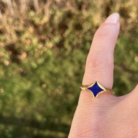 Echoing the mystique of a starlit sky, the Serenity Star ring is adorned with a rich lapis lazuli inlay, set in a gleaming gold-plated frame. The deep blue of the lapis, flecked with golden specks, captures the vastness of the night, while symbolizing wisdom and self-awareness. With its elegant diamond-shaped silhouette, this piece offers a touch of celestial elegance and meaningful reflection, perfect for layering or wearing alone.