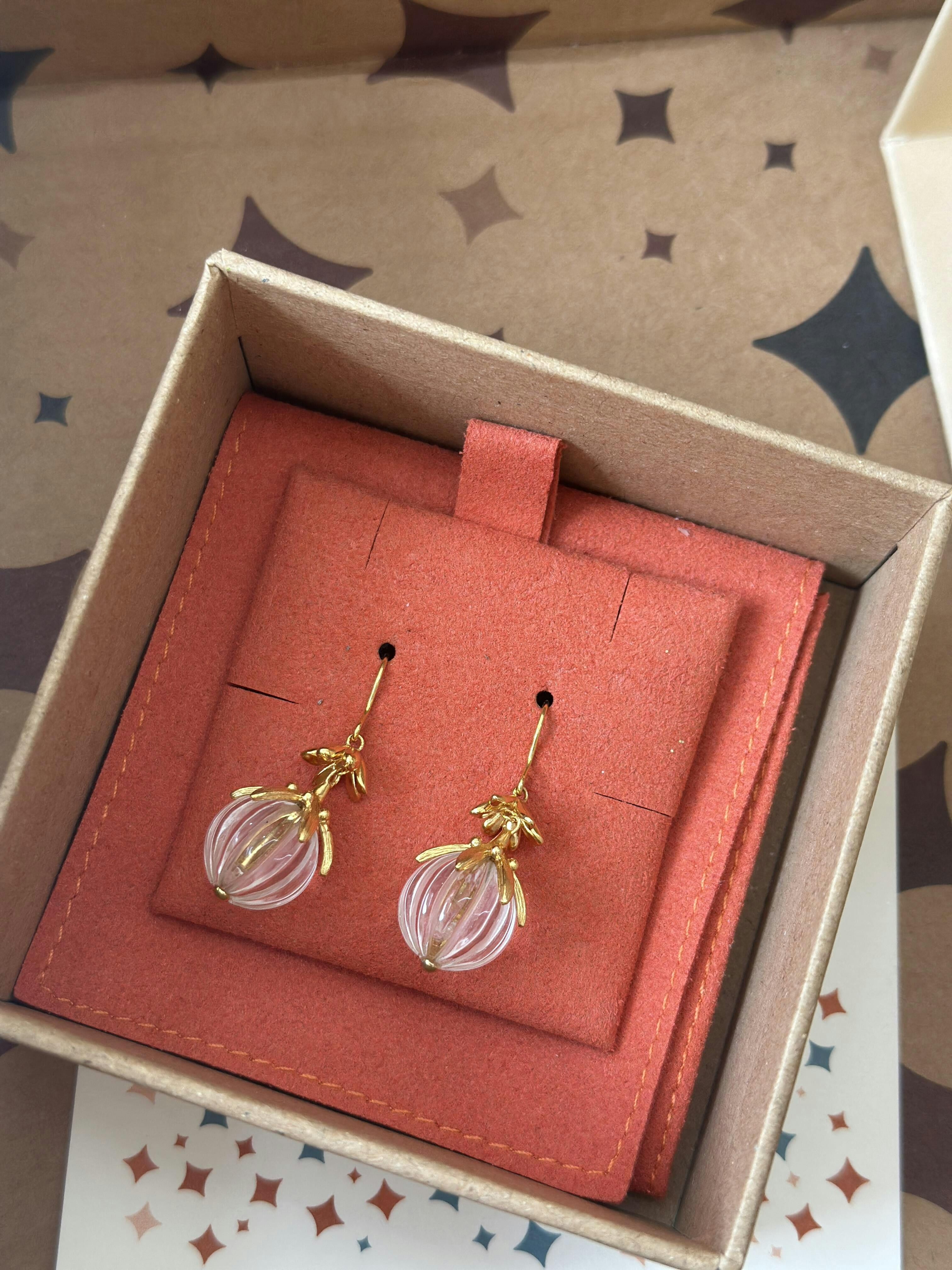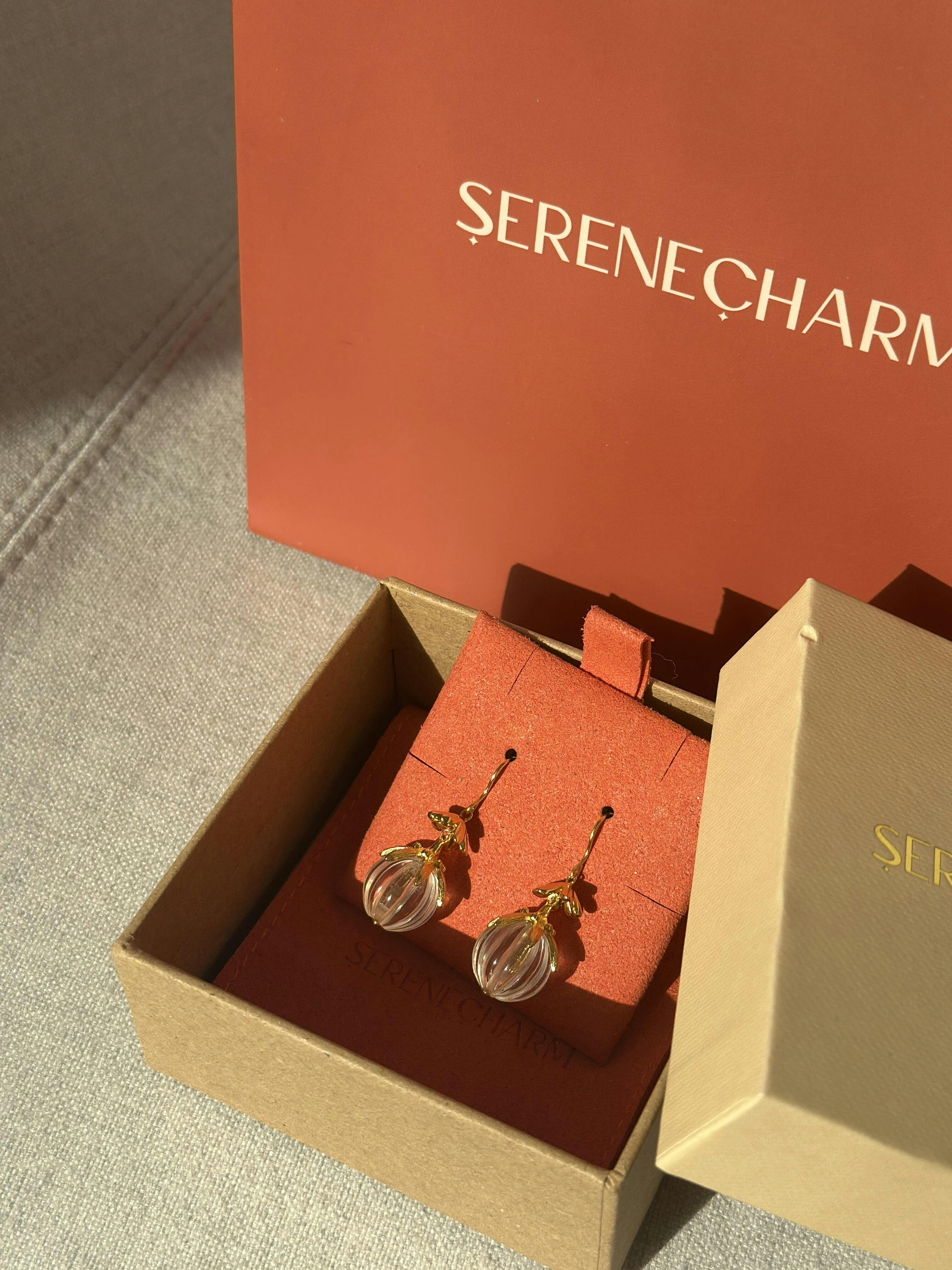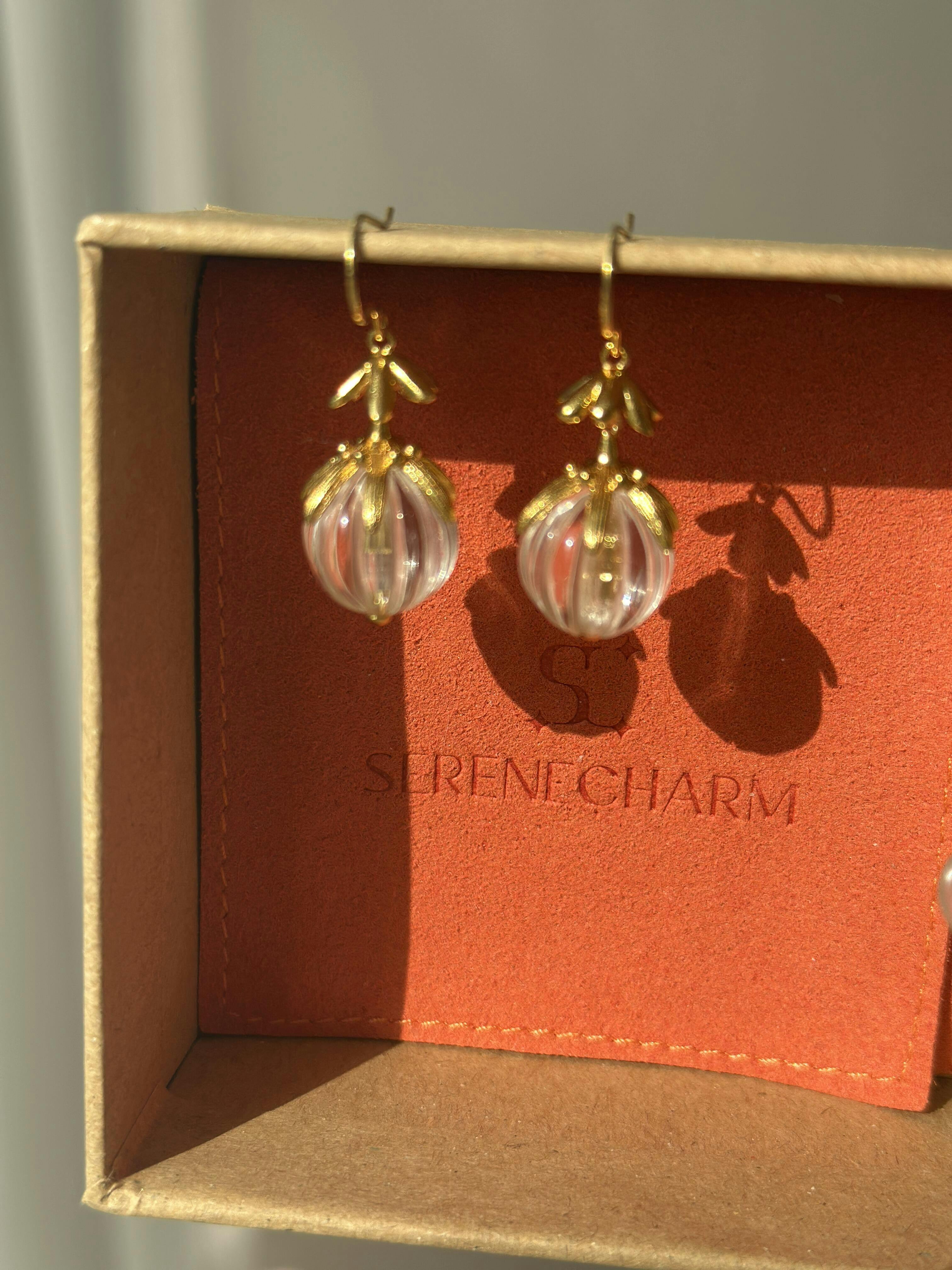 A celebration of nature’s quiet elegance, these earrings feature delicately carved rock crystal orbs suspended from golden mistletoe-inspired details. The soft curves and intricate leaves embody a serene harmony, while the luminous crystals radiate light and universal energy, symbolizing love and peace.