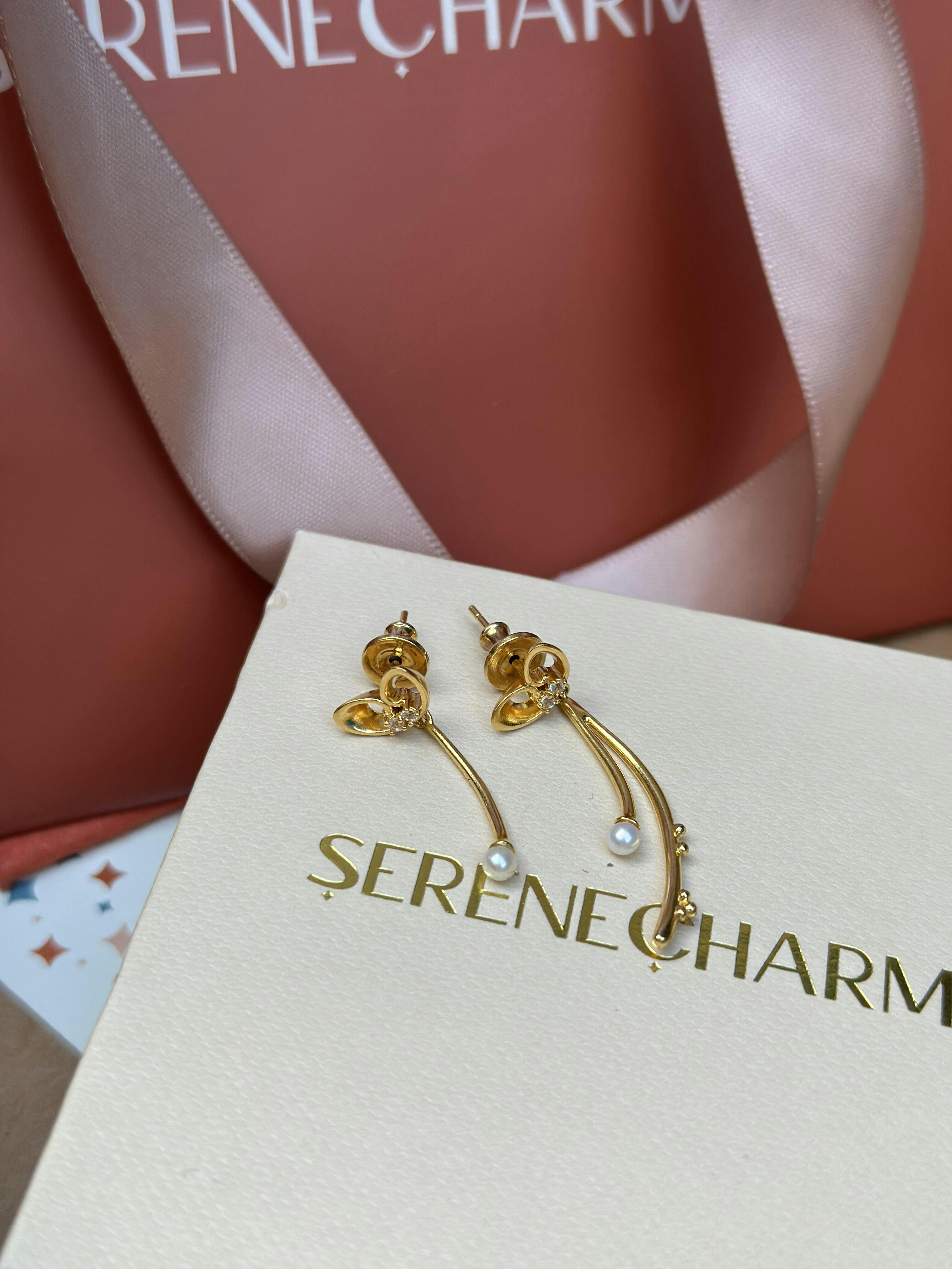 Graceful curves and natural elegance unite in this pair of earrings, inspired by the delicate form of mistletoe. The heart-shaped design, accented with sparkling white topaz, symbolizes love and harmony, while the flowing twig-like structure holds a soft pearl drop, embodying purity and wisdom. A poetic balance of nature’s beauty and refined artistry, this design offers a timeless, sculptural allure.